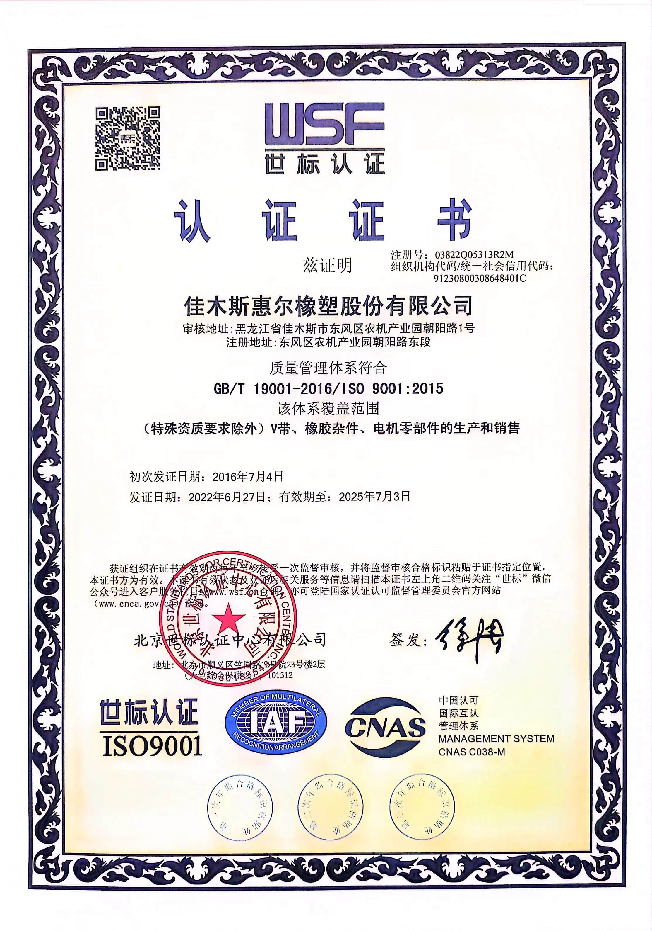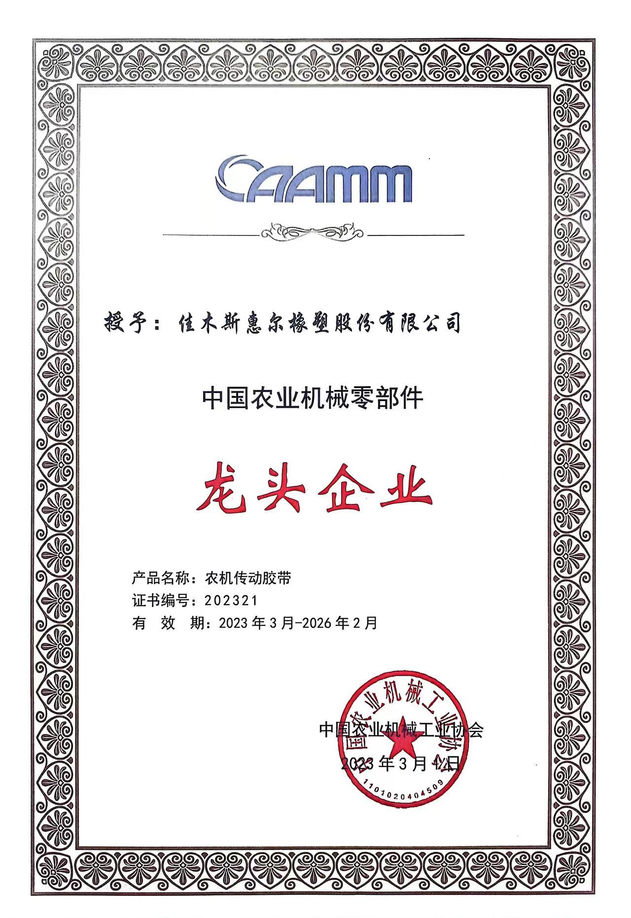 公司通過了ISO9001:2016質(zhì)量管理體系認證,榮獲了高新技術(shù)企業(yè)稱號,獲得了由中國農(nóng)業(yè)機械工業(yè)協(xié)會授予的農(nóng)機零部件(橡膠傳送帶)“龍頭企業(yè)”證書。環(huán)星品牌被評選為 “精耕杯”用戶滿意十佳農(nóng)業(yè)機械零部件產(chǎn)品金獎。產(chǎn)品還獲得全省用戶滿意產(chǎn)品、黑龍江省榮譽。
