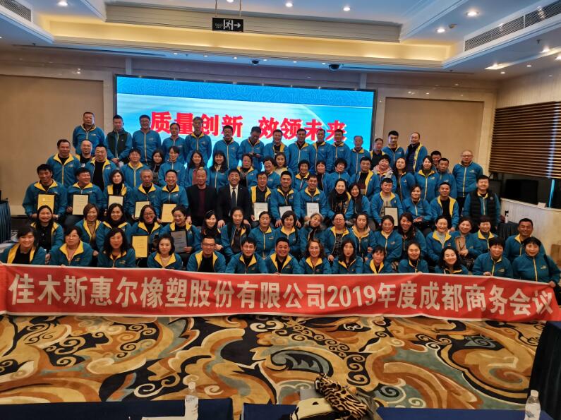 2019年11月25日,值此辭舊迎新之即,佳木斯惠爾橡塑股份有限公司2019-2020年度商務會議在四川成都圓滿召開,來自全國范圍的100多家經(jīng)銷商代表歡聚一堂,共謀發(fā)展。會議總結(jié)了2019年營銷工作,直面矛盾問題,科學預判形勢,就2020年營銷工作進行了部署和落實,會場充滿熱烈喜慶、奮發(fā)向上的氣氛。